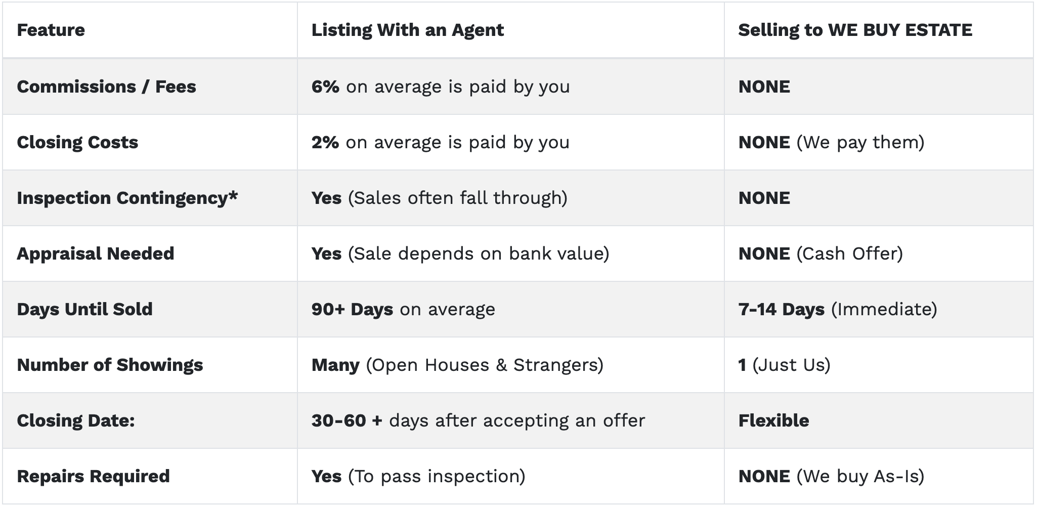 WE BUY ESTATE Math: > Sale Price - $0 Commissions - $0 Closing Costs - $0 Repairs - $0 Holding Costs = Total Peace of Mind.